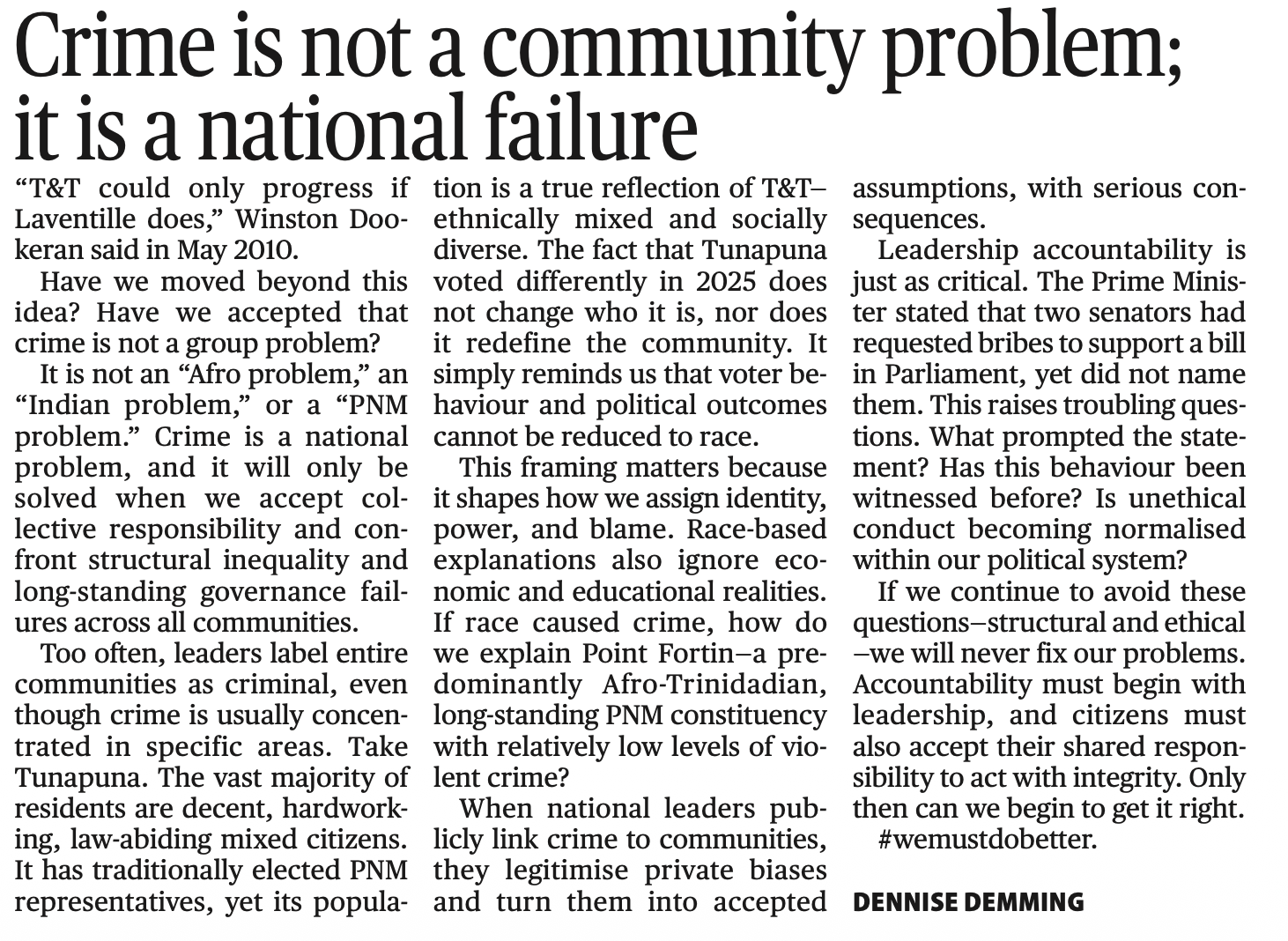 “Trinidad and Tobago could only progress if Laventille does,” Winston Dookeran said in May 2010. Have we moved beyond this idea? Have we accepted that crime is not a group problem? It is not an “Afro problem,” an “Indian problem,” or a “PNM problem.” Crime is a national problem, and it will only be solved when we accept collective responsibility and confront structural inequality and long-standing governance failures across all communities.