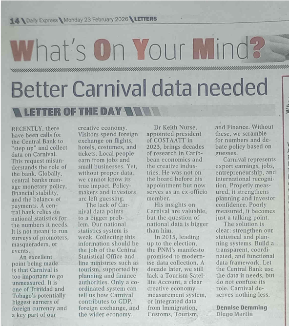 An excellent point made in a Sep 28, 2023 Saturday Express article “Carnival a forex earner”, is that Carnival is too important to go unmeasured. It is one of Trinidad and Tobago’s most significant earners of foreign currency and a key component of our creative economy. Visitors spend foreign exchange on flights, hotels, costumes, and tickets. Local people and small businesses earn from related seasonal jobs. Yet, without proper data, we cannot know its true impact. Policymakers and investors are left guessing. This is not the fault of the Central Bank; that’s not its job.