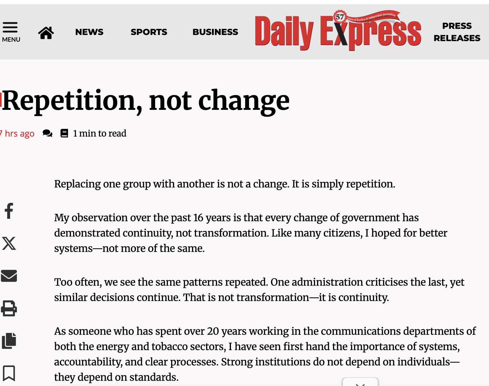Without such standards, public confidence erodes. Citizens are left uncertain about what conduct is acceptable in office, and political controversies risk overshadowing governance itself. Maintaining trust requires not only legality, but judgment, transparency, and a willingness to act when questions of integrity arise. The possibilities for us to transform our country, continue to occupy my mind, but often stimulate a pessimistic view. We are between a rock and a hard place.