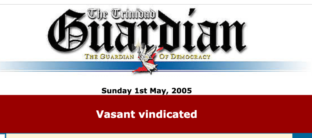 The Trinidad Guardian ran this story by Yvonne Teelucksingh on Sunday 1st May 2005 under the headline “Vasant vindicated”. At that time Colm Imbert was The Minister of Works and Transport under a PNM administration.