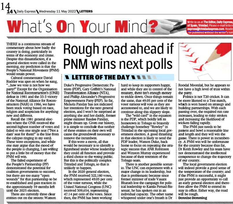 The local government elections will indeed provide a good sense of the temperature of the country and if the PNM is successful, it might just provide an opportunity to call early general elections and therefore allow the PNM to extend its stay in office. Either way, the road will be rough.