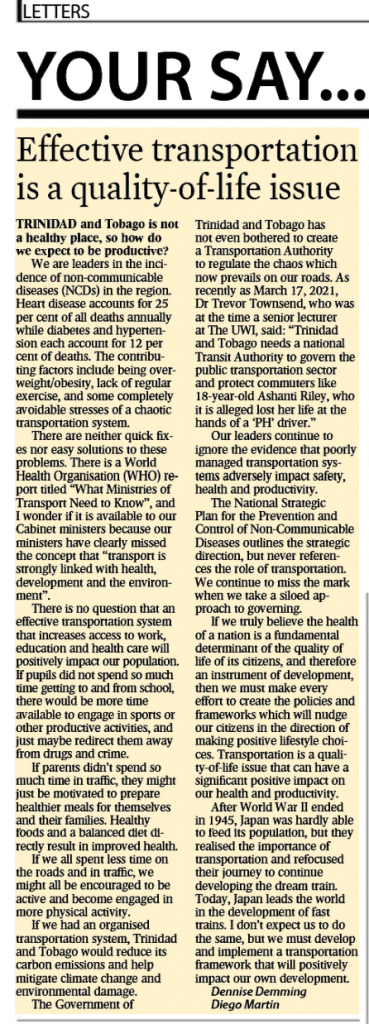 If we had an organized transportation system, Trinidad and Tobago would reduce its carbon emissions and help mitigate climate change and environmental damage.