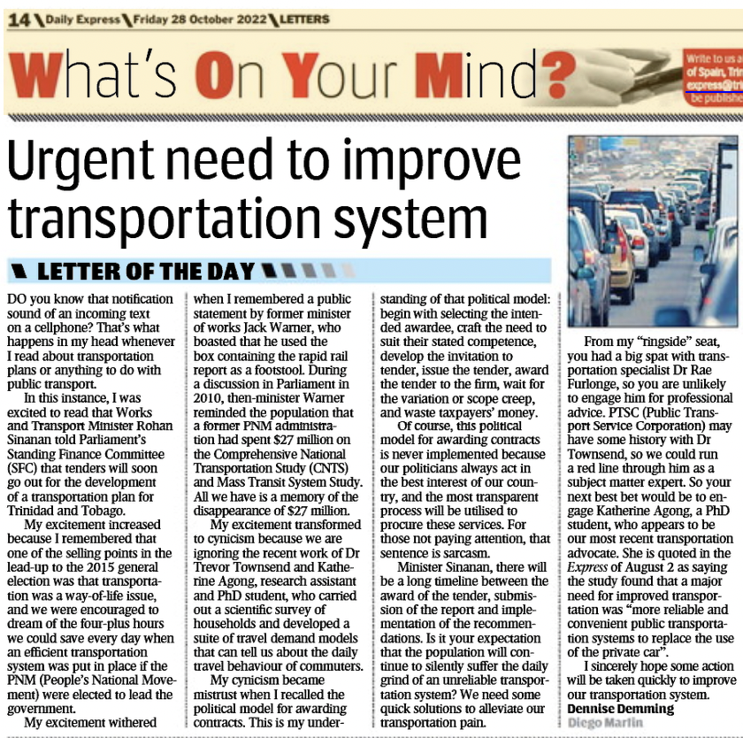 From my “ringside” seat you had a big spat with Transportation specialist Dr. Rae Furlonge so you are unlikely to engage him for professional advice. PTSC may have some history with Dr. Trevor Townsend so we could run a redline through him as a subject matter expert. So, your next best bet would be to engage Katherine Agong, a Ph.D. student who appears to be our most recent transportation advocate. She is quoted in the Express Newspaper of August 02, 2022, as saying that the study found that a major need for improved transportation, was “more reliable and convenient public transportation systems to replace the use of the private car.”