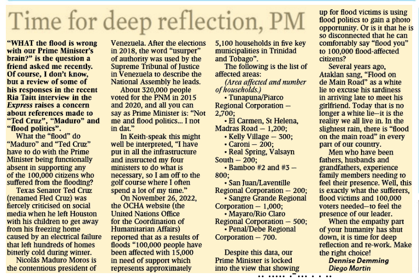 ‘WHAT the flood is wrong with our Prime Minister’s brain?’ is the question a friend asked me recently. Of course, I don’t know, but a review of some of his responses in the recent Ria Taitt interview in the Express raises a concern about references made to ‘Ted Cruz’, ‘Maduro’, and ‘flood politics’.