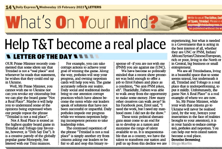 Our Prime Minister recently commented that some idiots say that Trinidad is not a “real-place” and whenever he reads that statement, he wishes that they could end up in Ukraine. Well Mr. Prime Minister, you cannot wish me to the Ukraine nor can you revoke my citizenship but we can play the board game “Not a Real Place”. Maybe it will help you to understand some of the opinions being expressed when our people repeat the phrase “Trinidad is not a real place”.