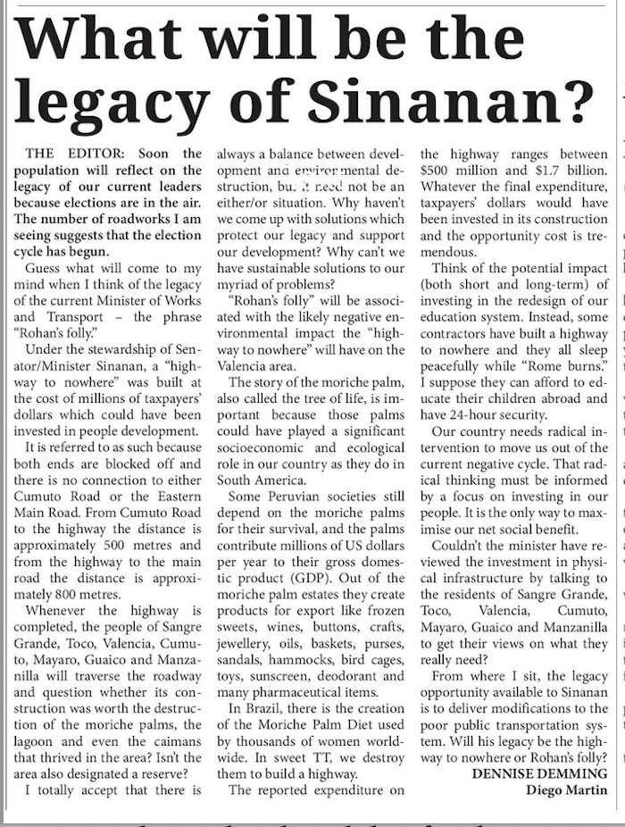 Whenever the HTN is completed, the people of Sangre Grande, Toco, Valencia, Cumuto, Mayaro, Guaico, and Manzanilla will traverse the roadway and question whether the construction of the road was worth the destruction of the Moriche palms, the lagoon, and even the Caiman who thrived in the area? Isn’t the area also designated a reserve? I totally accept that there is always a balance between development and environmental destruction, but it need not be an either/or situation. Why haven’t we come up with solutions which protect our legacy and support our development? Why can’t we have sustainable solutions to our myriad of problems? “Rohan’s Folly” will be associated with the likely negative environmental impact the HTN will have on the Valencia area.