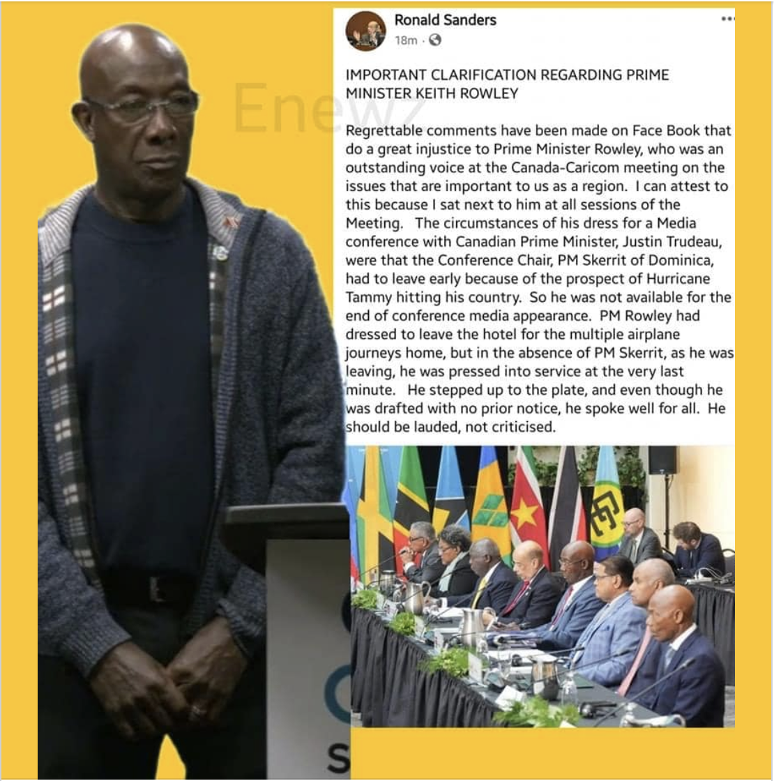 What is happening to my Prime Minister? What was his inspiration to be casually dressed at the closing ceremony of the inaugural Canada-CARICOM Summit. A photograph from the closing ceremony showed Canada’s Prime Minister, Justin Trudeau, and Guyana’s President and Dr. Irfaan impeccably dressed while my Prime Minister wore a casual jersey paired with a hooded sweater.