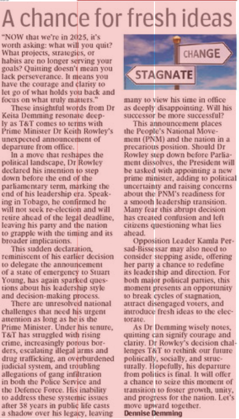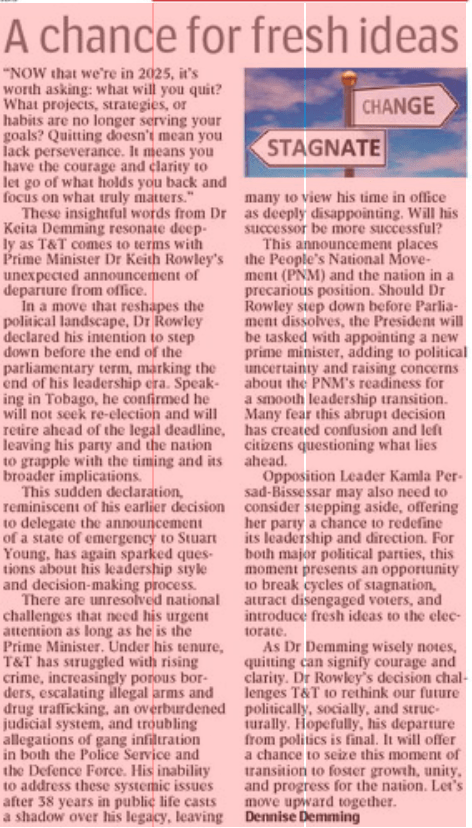 As Dr Demming wisely notes, quitting can signify courage and clarity. Dr Rowley’s decision challenges T& T to rethink our future politically, socially, and structurally. Hopefully, his departure from politics is final. It will offer a chance to seize this moment of transition to foster growth, unity, and progress for the nation. Let’s move upward together.