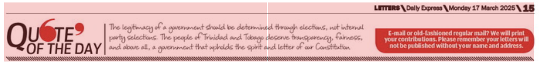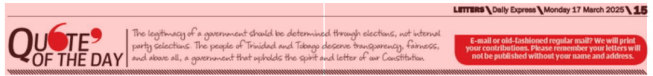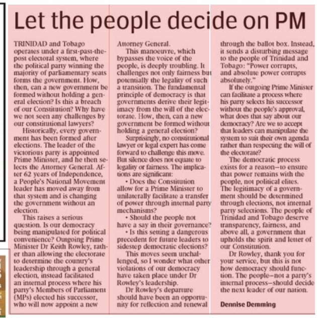 The democratic process exists for a reason—to ensure that power remains with the people, not political elites. The legitimacy of a government should be determined through elections, not internal party selections. The people of Trinidad and Tobago deserve transparency, fairness, and above all, a government that upholds the spirit and letter of our Constitution.