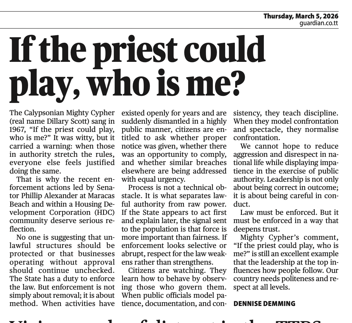 That is why the recent enforcement actions led by Senator Phillip Alexander at Maracas Beach and within a Housing Development Corporation (HDC) community deserve serious reflection.