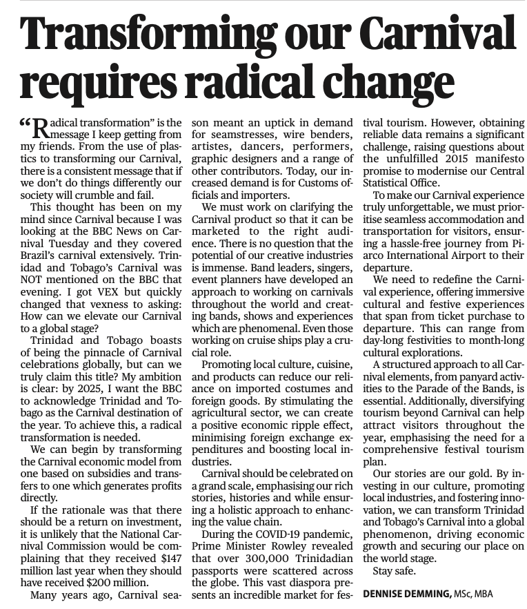 Our stories are our gold. By investing in our culture, promoting local industries, and fostering innovation, we can transform Trinidad and Tobago’s Carnival into a global phenomenon, driving economic growth and securing our place on the world stage.